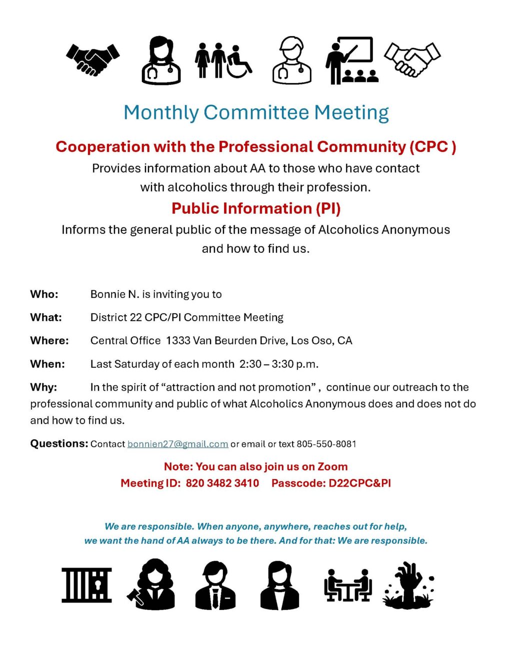 Central Coast Central Office Intergroup Representatives Meeting Zoom only… ID: 958 0124 0779 no passcode One representative for each group! Is your group involved?