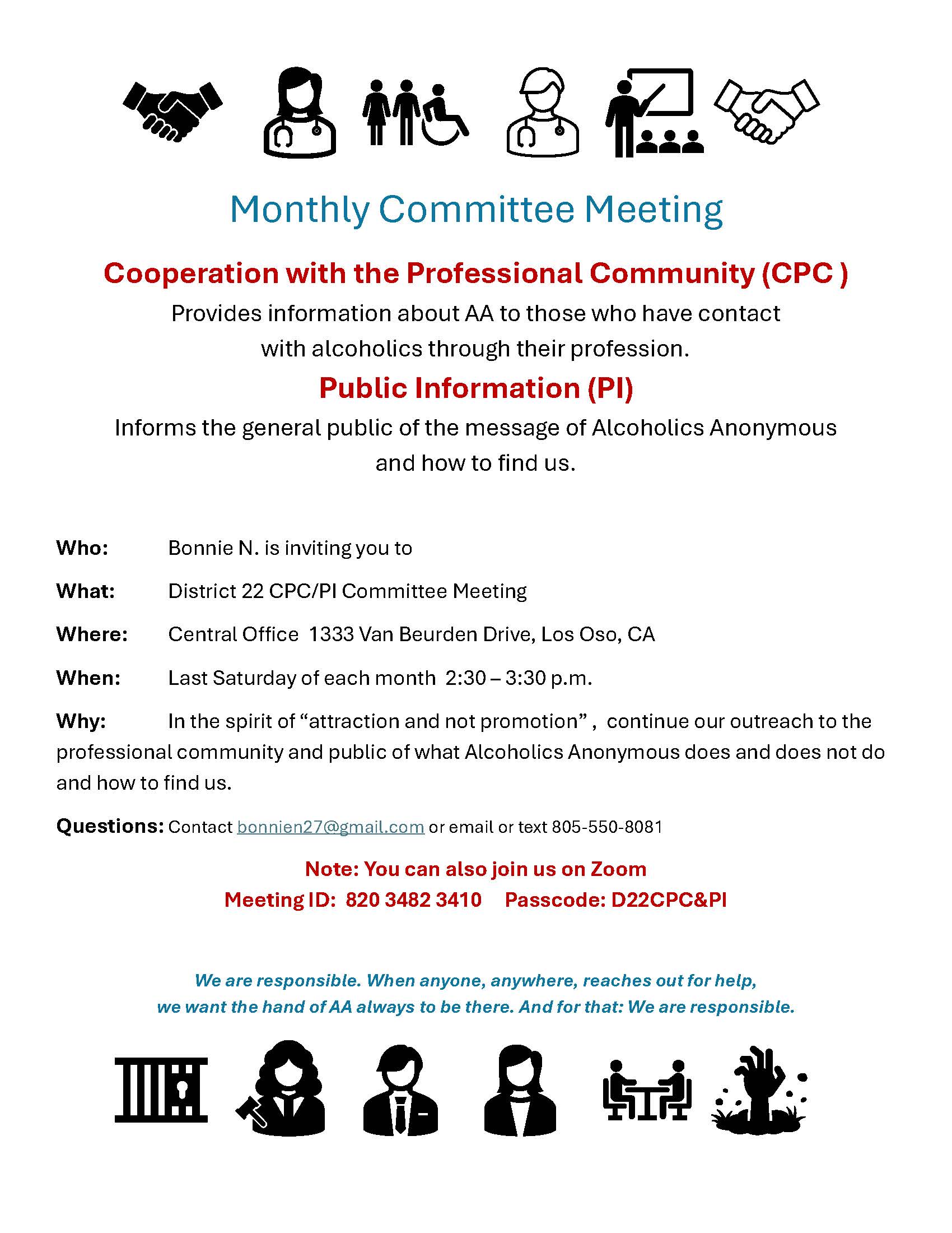 Central Coast Central Office Intergroup Representatives Meeting Zoom only... ID: 958 0124 0779 no passcode One representative for each group! Is your group involved?